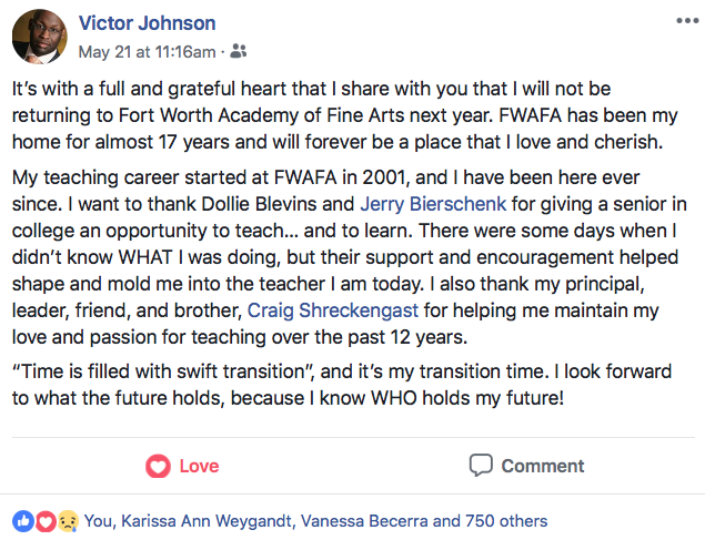 I remain proud to be one of Mr. Johnson’s first students at FWAFA, and it is sad to say his time at FWAFA has come to an end. He will be missed by so many, including, the many students who have been mentored by him and the parents who experienced the positive impact Mr. J had on their children's lives.
